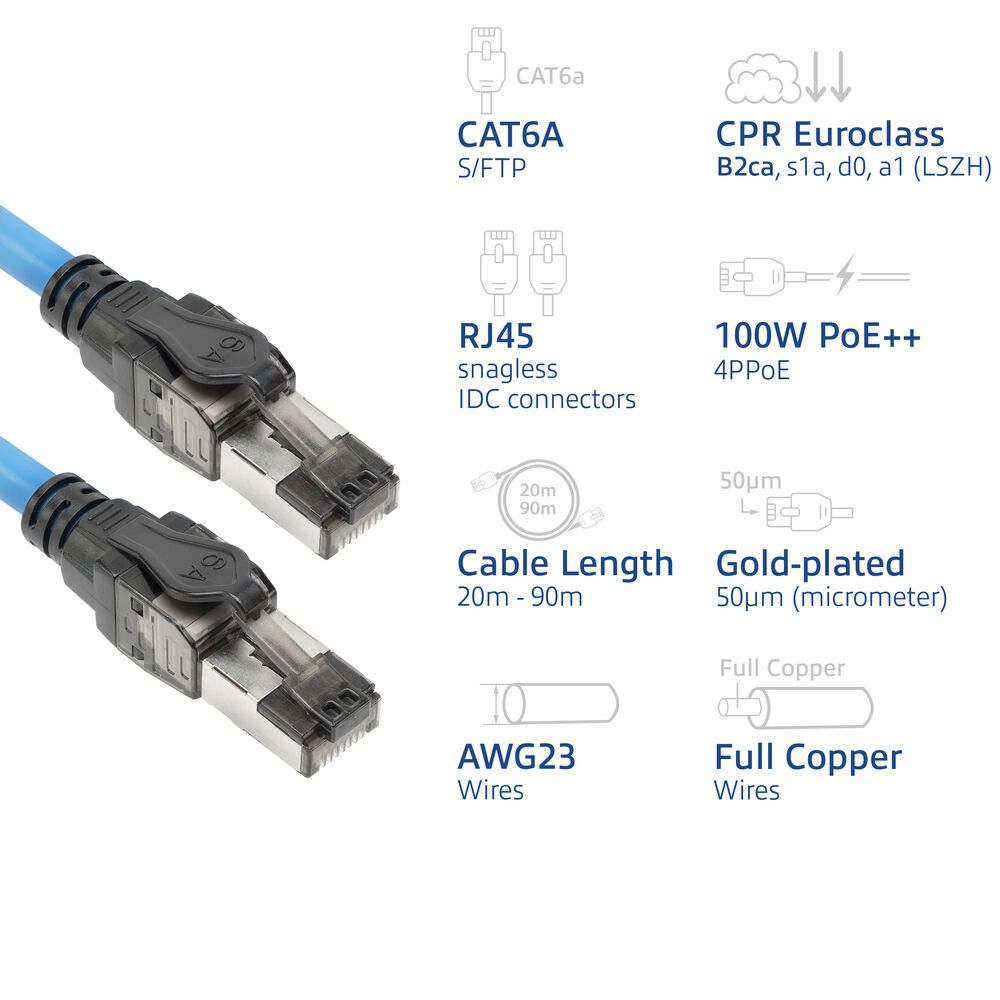 Az S/FTP CAT6A előre gyártott tömör szerelőkábel minden alkalmazáshoz és épülethez alkalmas, beleértve a magas kockázatú környezeteket is, a CPR Euroclass B2ca besorolásának köszönhetően. A kábel támogatja a 4PPoE / PoE++ 100 W-os alkalmazásokat. A szerelőkábel teljes réz 23AWG vezetékekkel és 50 µ aranyozott RJ45 érintkezőkkel rendelkezik, amelyek IDC-n keresztül vannak csatlakoztatva, és megfelel az ANSI/TIA-568.2-D és az ISO/IEC 11801-1 nemzetközi szabványoknak.