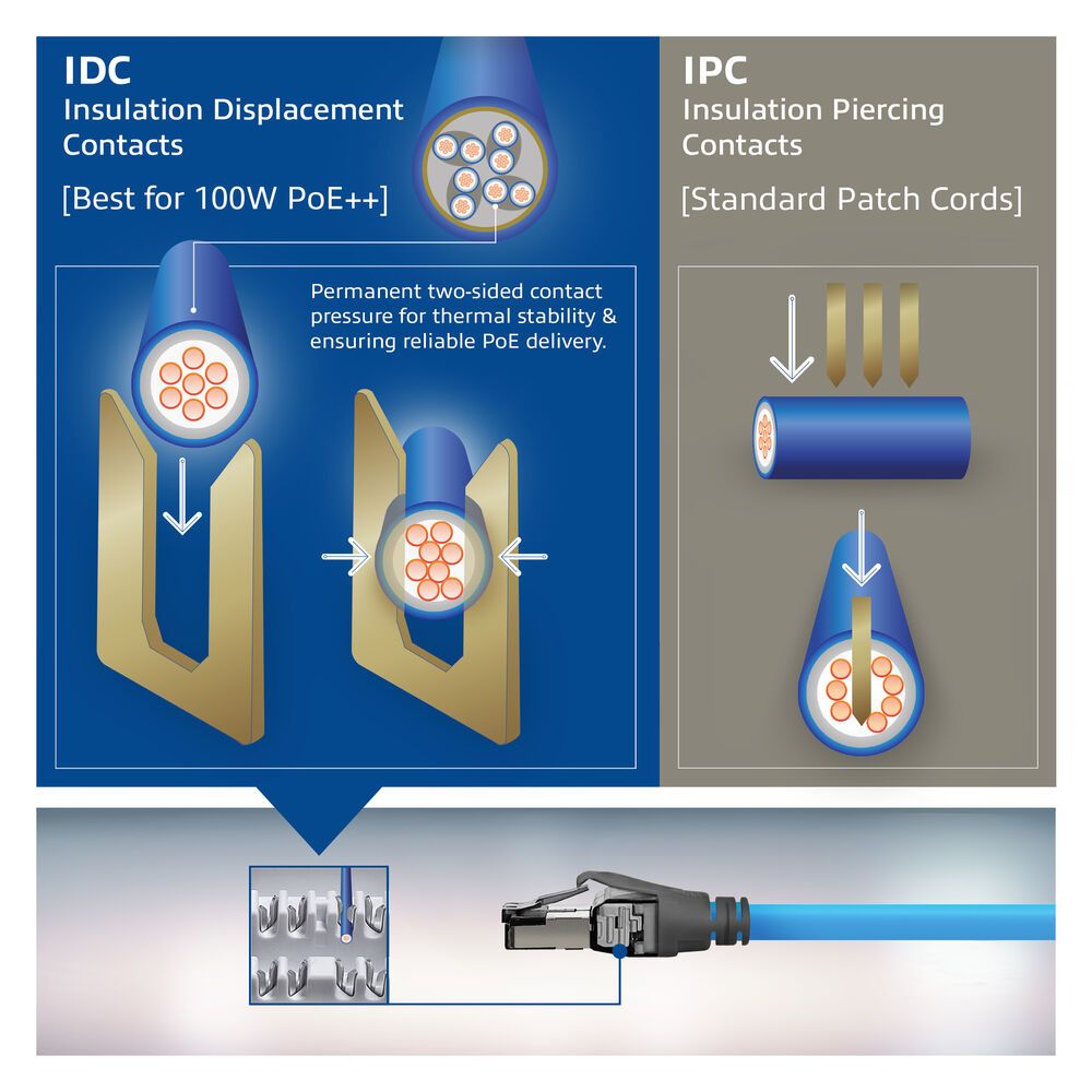 Ezeket a szilárd szerelőkábeleket 100 W-os Power over Ethernet alkalmazásokhoz tervezték az IDC (Insulation Displacement Contacts) használatának köszönhetően. Ez az előre gyártott kábelszerelvény 23AWG rézmagos vezetékekkel és IDC csatlakozókkal rendelkezik, és ezáltal stabil és tartós hálózati kapcsolatot biztosít a 4PPoE 100W (4-es típusú) alkalmazásokban.
