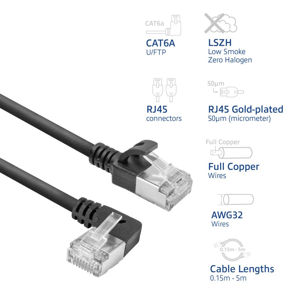 A CAT6A U/FTP vékony adatközponti patch kábelek átmérője kisebb (3,8 mm vs. 5,9 mm) a hagyományos CAT6A patch kábelekénél. A hajlítási sugara kisebb a standard patch kábelekéhez képest. Ez jobb légáramlást eredményez a szerverrackben vagy a hálózati szekrényben. A patch kábel egyenes RJ45 csatlakozóval és egy 90°-os balra hajlított RJ45 csatlakozóval rendelkezik. Ideális olyan helyekre, ahol korlátozott a hely, és nem lehet megnövelni a hajlítási sugarat. Például hálózati szekrényekben és berendezések mögött.