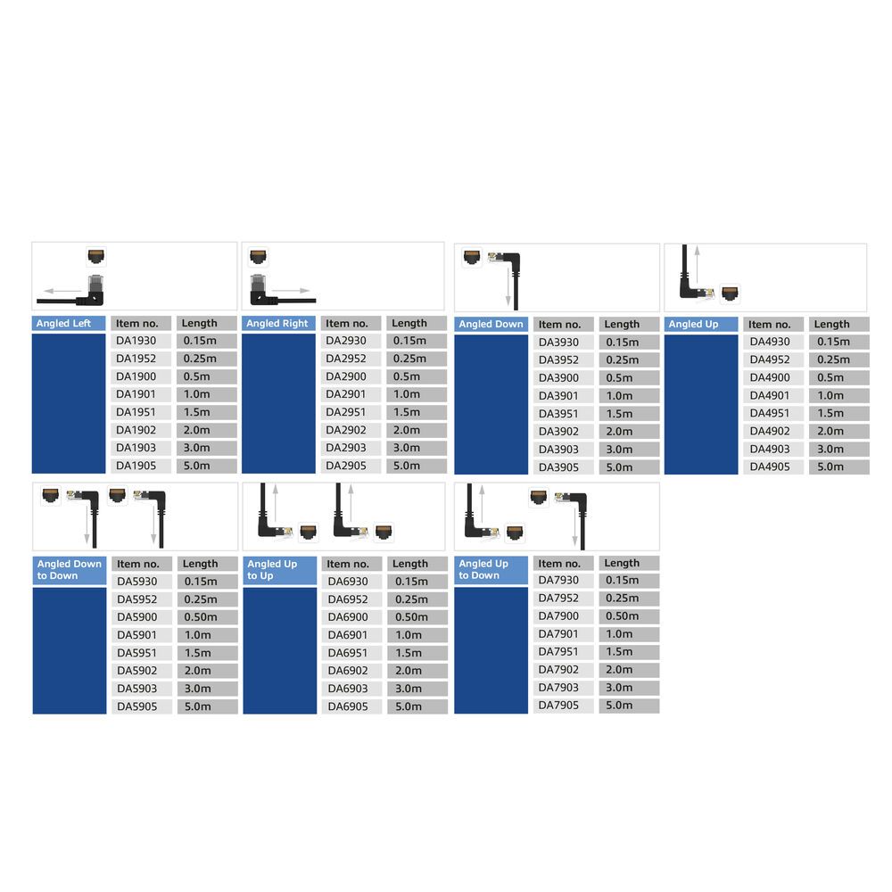 A patch kábel egyenes RJ45 csatlakozóval és egy 90°-ban felfelé hajlított RJ45 csatlakozóval rendelkezik. Ideális olyan helyekre, ahol korlátozott a hely, de a hajlítási sugár nem lehet kompromisszum. Például hálózati szekrényekben és berendezések mögött.