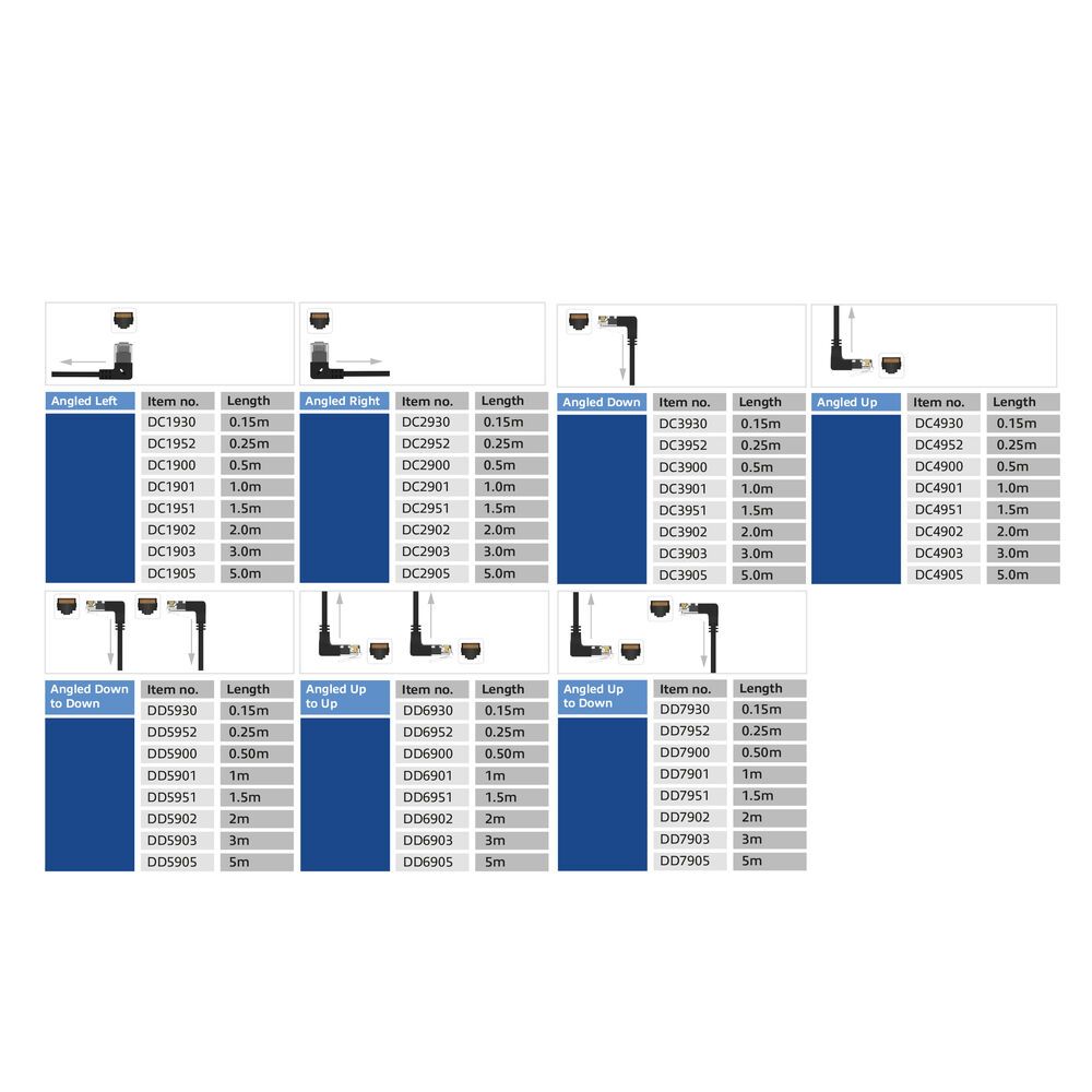 Egyenes, 90°-os felfelé, balra vagy jobbra hajlított RJ45 csatlakozóval is kapható.