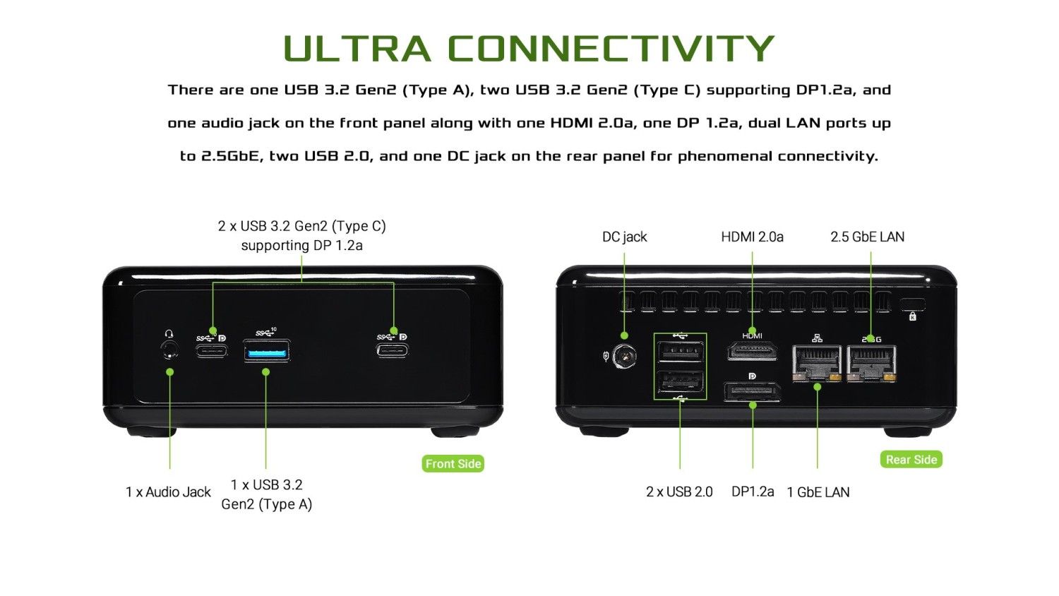 Mini PC, No OS, AMD SoC, Memória nélkül, 3200MHz, WLAN, Gigabit, 2.0, AMD Radeon Graphics, 2xUSB2.0, 2xUSB3.1, 2xUSB Type-C, HDMI, DisplayPort, 117,5x47,85x110mm, Black, Teljesítmény felvétel96W