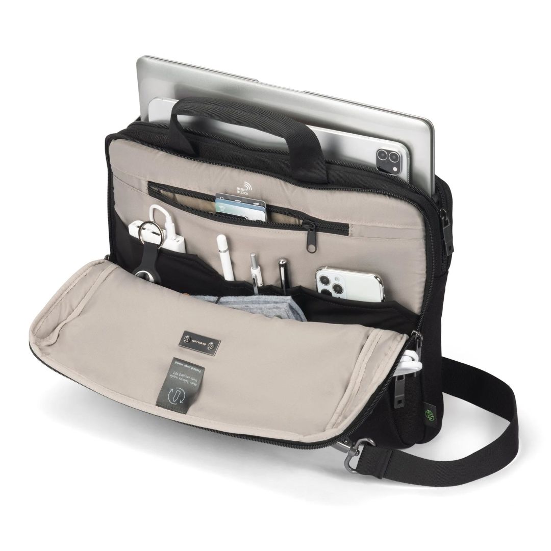 A FIVE Slim Case FIVE könnyű, biztonságos és a könnyed mobilitás érdekében készült, és terjedelem nélkül védi az alapvető dolgokat. Zárható notebookrekesze a DCT Notebook Protection funkcióval maximális biztonságot nyújt, míg a beépített csúszózseb akár 12,9"-os táblagépeket is biztosít. Az elülső rekesz a tartozékokat szervezi, a különálló hátsó rekesz pedig a dokumentumokat tartja. A 16,5 újrahasznosított PET-palackból készült táska fenntartható és praktikus választás a modern szakemberek számára.