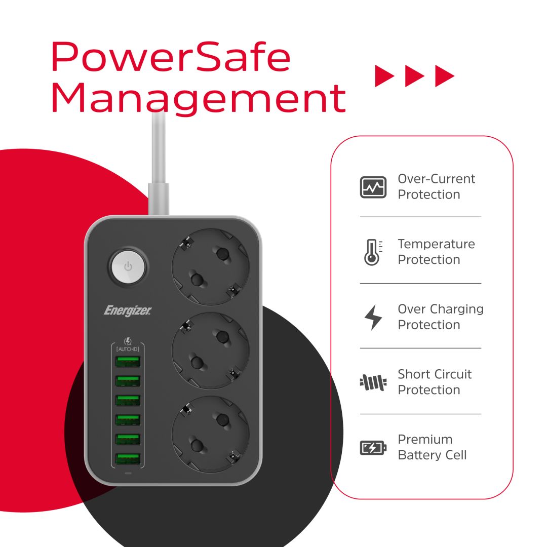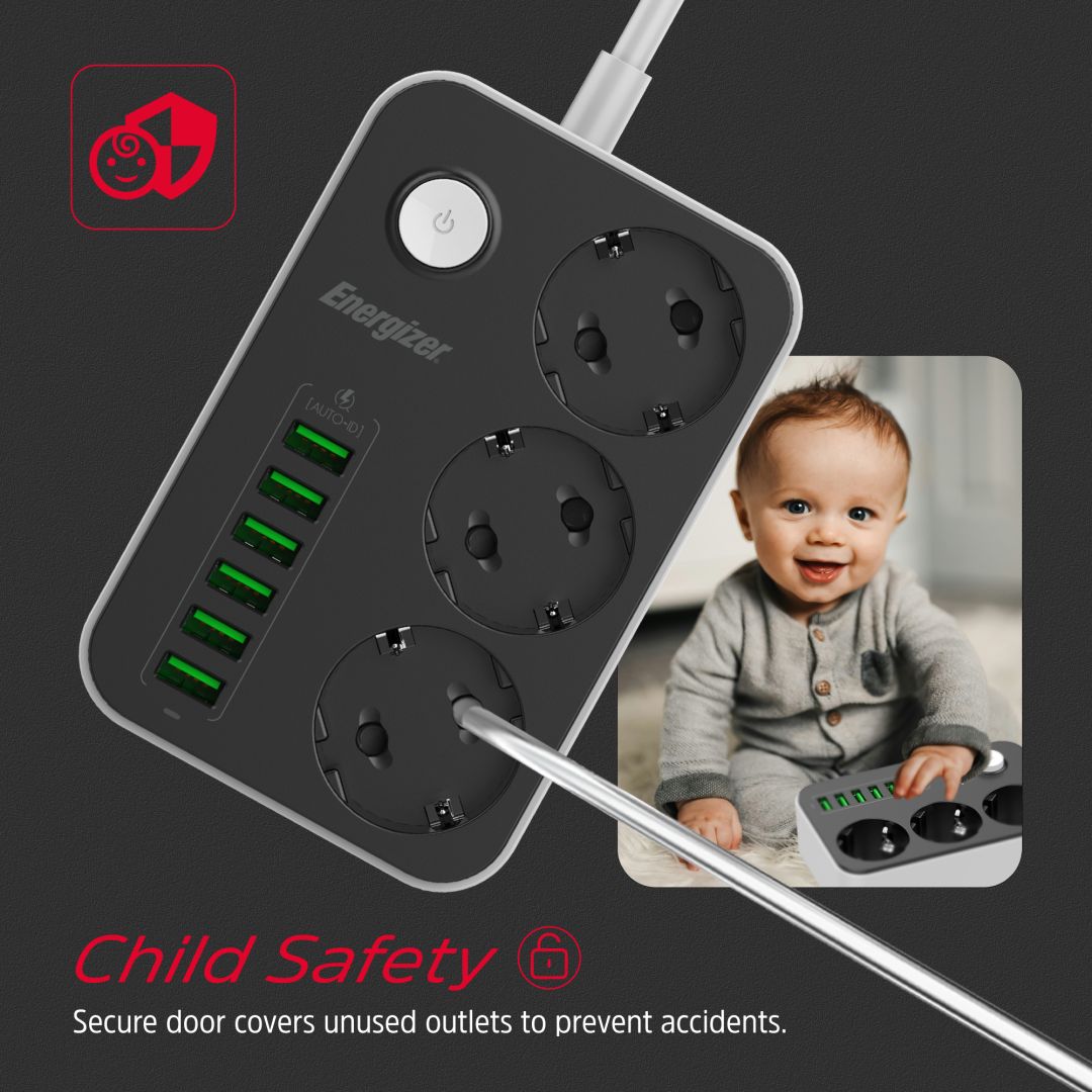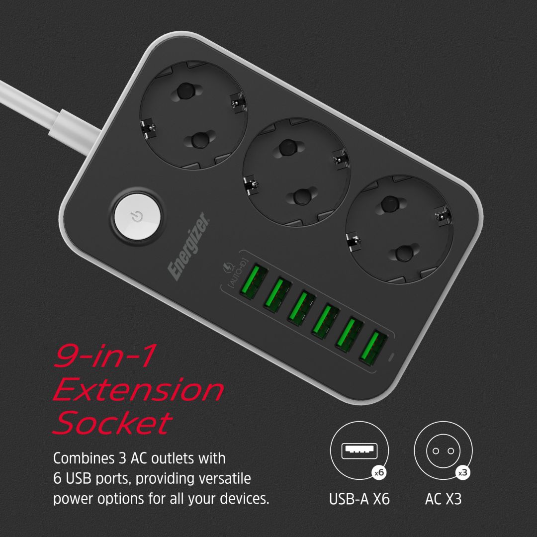Elosztó, 3xDIN, 2m, Kapcsoló, USB, Black/Grey