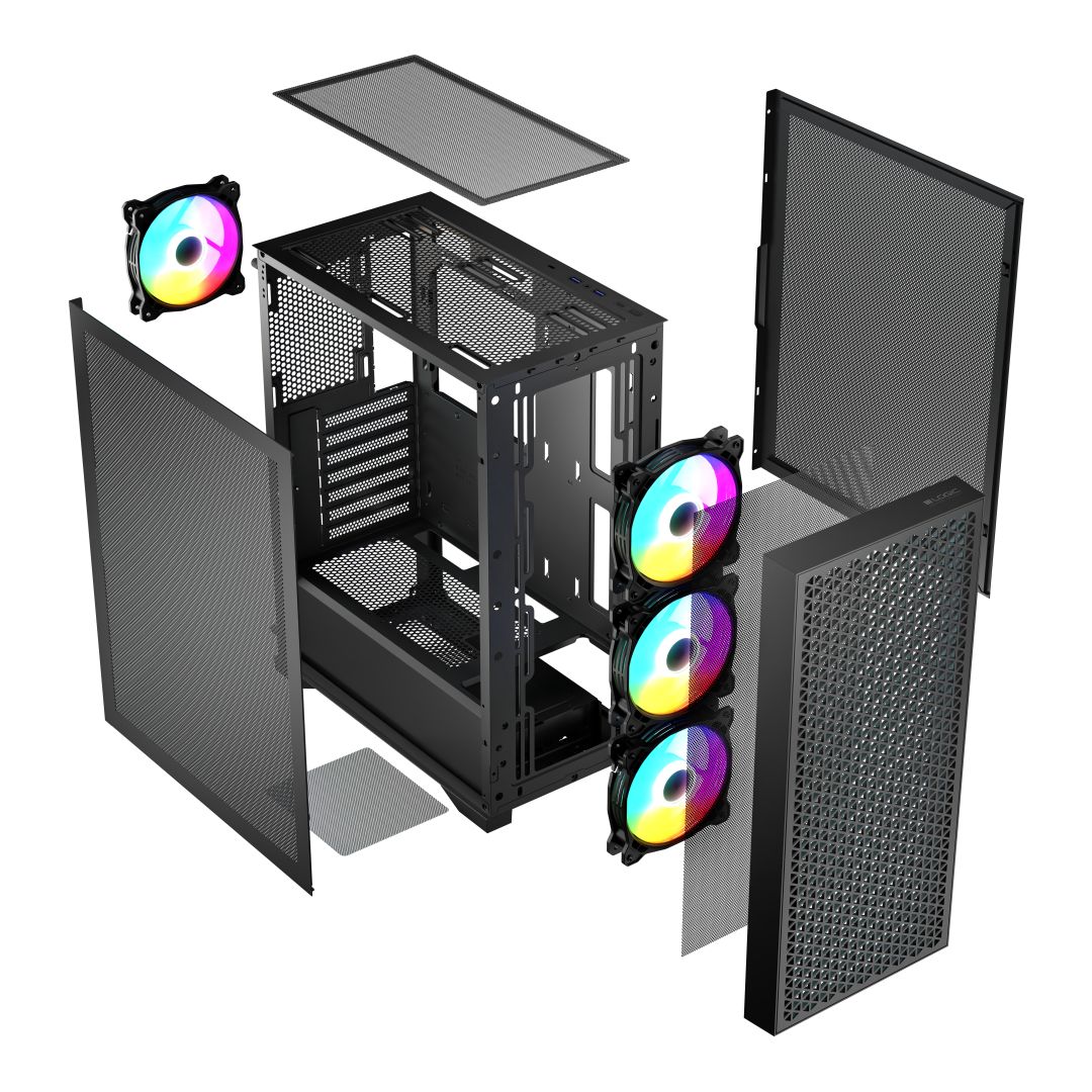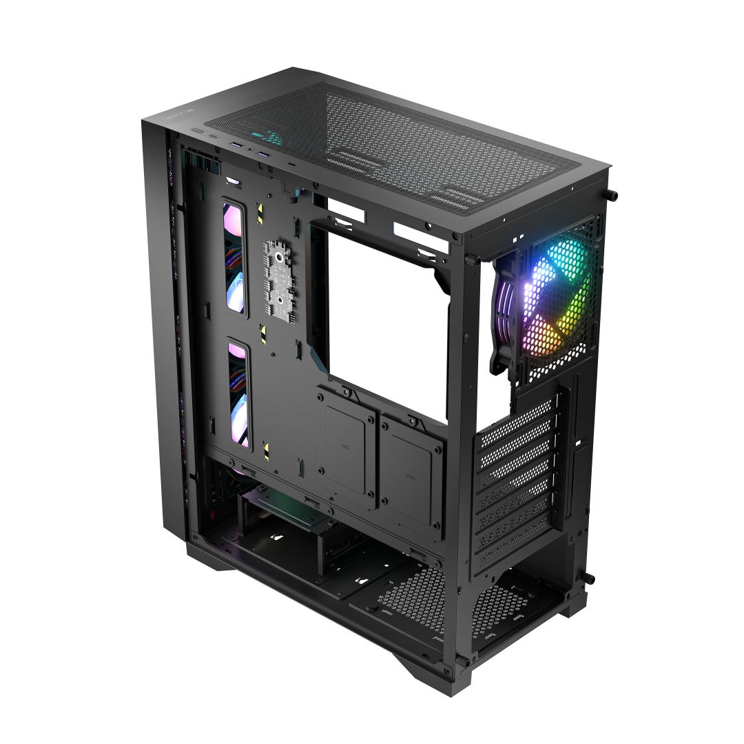 ATX, Black, 1x3,5", 2x2,5", 2xUSB3.0, 1xUSB Type-C, Audio, Táp nélkül, 385x200x456mm, Ventilátor:4x12cm, RGB, Gamer