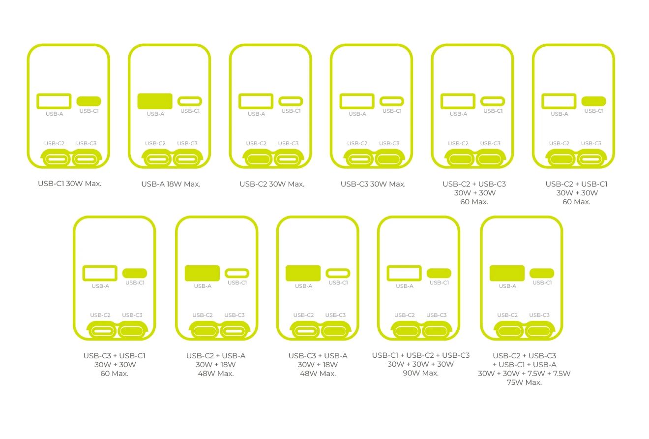 Az adapter PD (Power Delivery) technológiával van felszerelve, amely gyorsabb és hatékonyabb töltést tesz lehetővé. Az eszköz igényeinek megfelelően dinamikusan szabályozza az áramellátást, így biztosítva az optimális töltési sebességet. A 90 W teljesítmény akkor érvényes, ha az USB-C1 + USB-C2 + USB-C3 csatlakozókat egyszerre töltik.