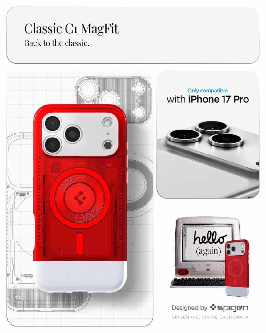 Helló (ismét). Az ikonikus iMac G3 előtt tisztelgő, felújított Classic C1 gondoskodik arról, hogy az iPhone 17 mindig visszatérjen. Tekints vissza az időben a retro áttetsző dizájnjával. Tapasztald meg a modern technológiát a teljes MagSafe kompatibilitást biztosító MagFit segítségével. Megvagyunk.