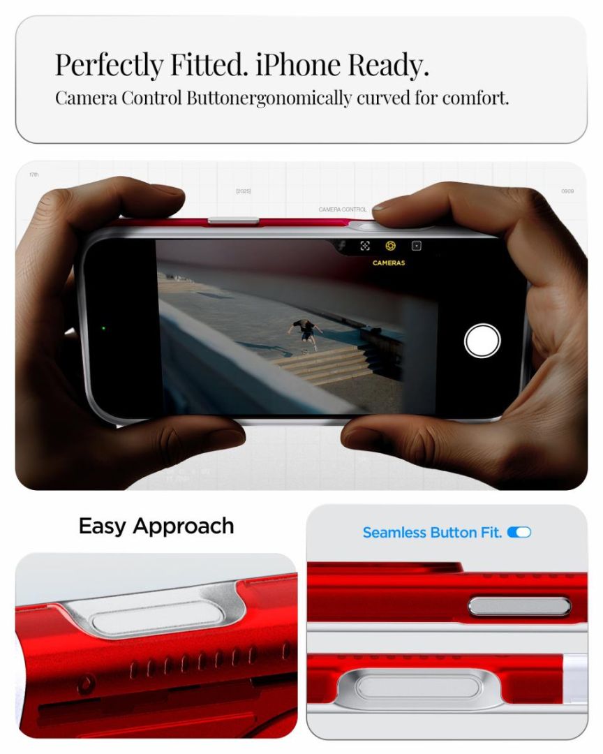 A kamera vezérlőgombját vékony TPU réteg borítja, amely védelmet nyújt, miközben megőrzi a funkcionalitást.