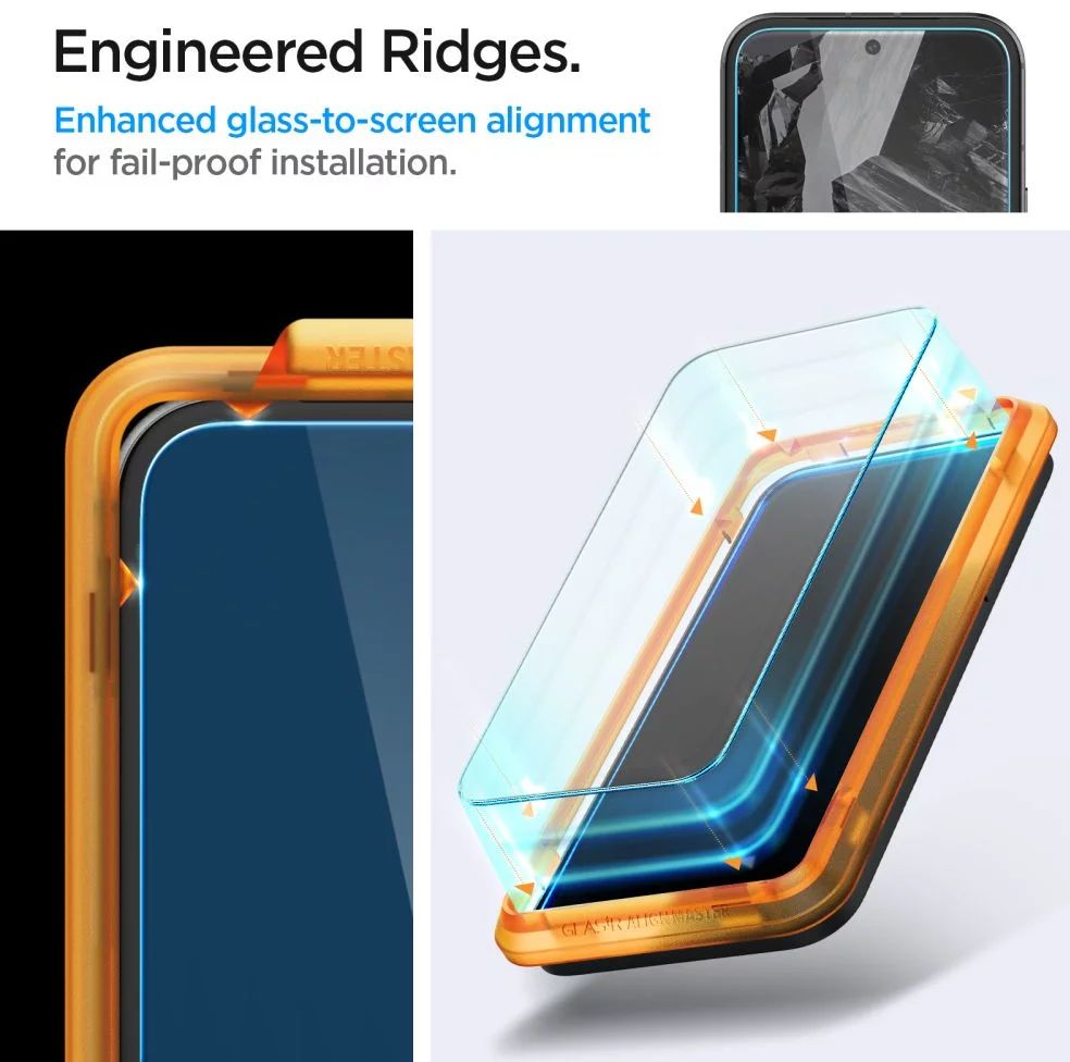 A Spigen "AlignMaster" sorozatának edzett üvegét a telefon elejére tökéletesen szabott rögzítőkerettel rögzítették, amelynek köszönhetően tökéletesen elhelyezhető a képernyőn. A gyártó annyira leegyszerűsítette a rögzítési folyamatot, hogy az minden felhasználó számára teljesen intuitív.