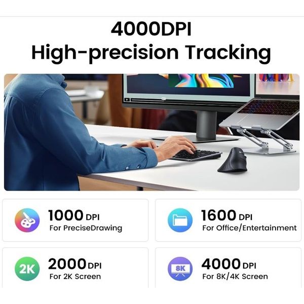 Vezeték nélküli, Wireless 2,4GHz, Bluetooth, Optikai, 4000DPI, Black, Vertikális