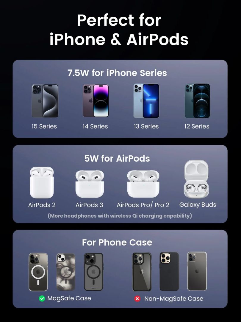 Széles kompatibilitás: Töltőállványunk számos eszközzel kompatibilis, beleértve az iPhone 15/15 Pro/15 Pro Max/14/13/12 sorozatot, AirPods Pro 2/1, AirPods 3/2, Galaxy Buds, iWatch Ultra/8/7/SE/6/5/4/3/2 és a legtöbb Qi-támogatású eszközt. Az optimális töltés érdekében MagSafe tartó vagy telefonház nélküli használatot ajánlunk.