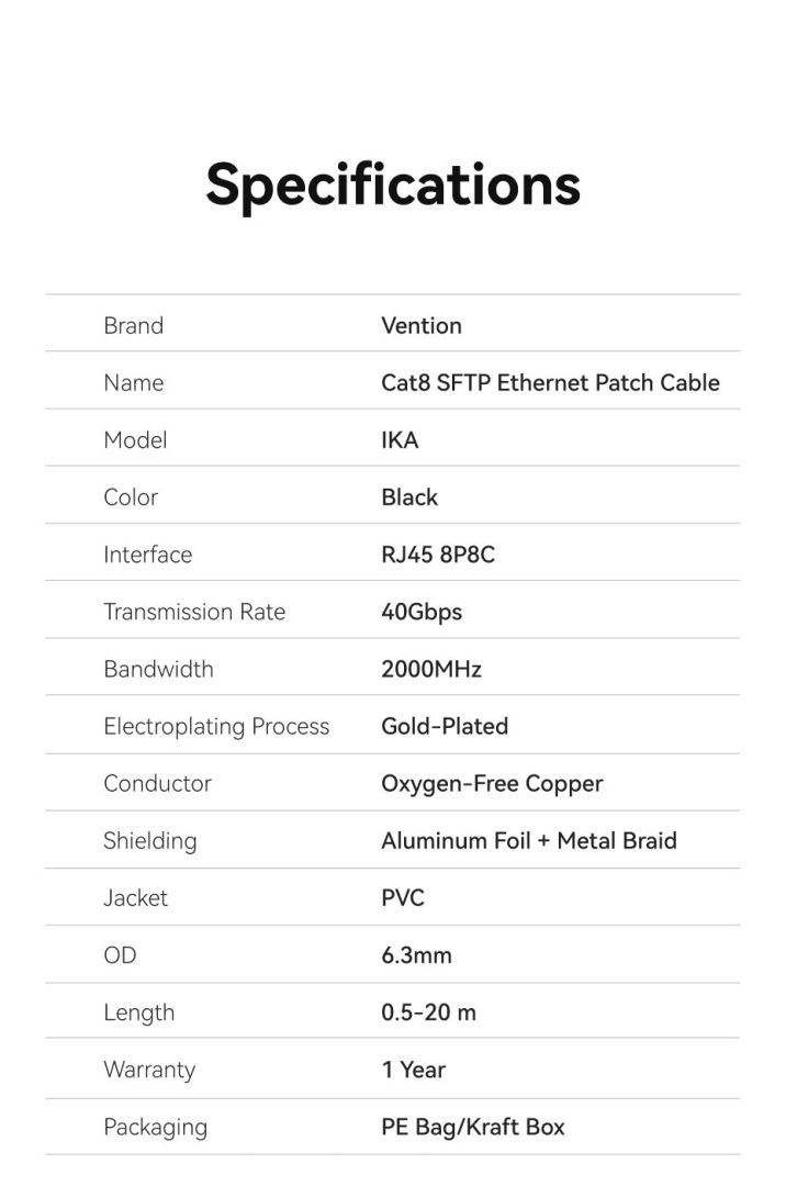 Akár távolról dolgozik, akár online tanul, vagy egyszerűen csak szórakozásra használja az internetet, a Vention kábel megfelel az Ön igényeinek. A 40 Gbps átviteli sebességnek köszönhetően nagyméretű fájlokat továbbíthat, tartalmakat streamelhet a legmagasabb minőségben, és késedelem nélkül játszhat online. A 2000 MHz-es átviteli sávszélesség páratlan jelstabilitást biztosít, kiküszöböli az interferenciát, és biztosítja a hálózat zavartalan működését.