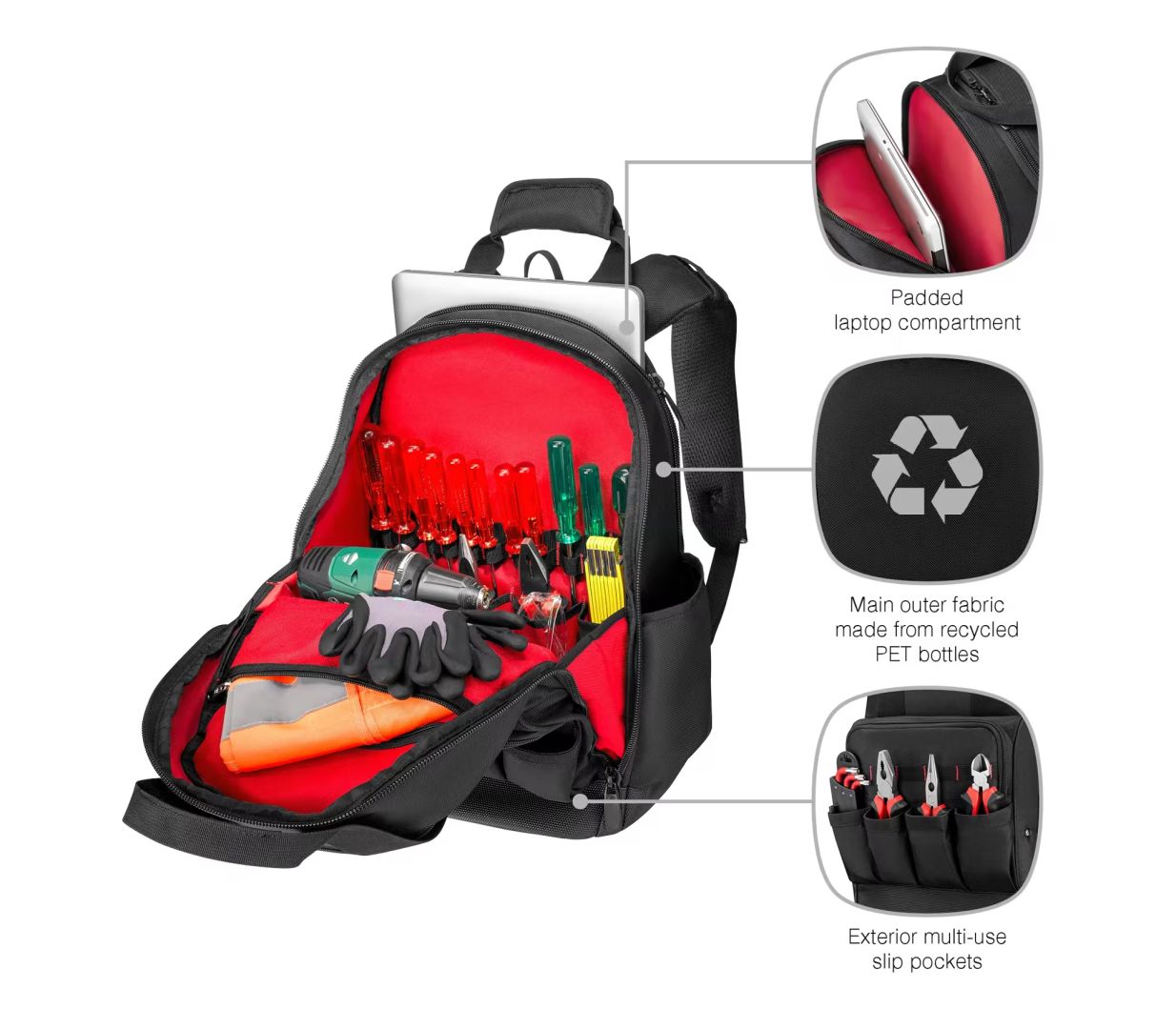 Fedezze fel a Tool Backpack Advanced, egy robusztus és praktikus szerszámosládát hátizsák formájában. A szerelők, technikusok és építkezési munkások számára tervezett hátizsák különböző zsebekkel rendelkezik, amelyekben kéziszerszámok, szögek, kalapácsok, csavarhúzók és egyéb eszközök tárolhatók. A robusztus fő külső anyag újrahasznosított PET-palackokból készült, így tartós választás. A funkciók közé tartozik egy párnázott rekesz akár egy 16"-os laptop számára, egy tágas főrekesz, egy kiterjedt szerszámszervező és egy szemüvegrekesz. A főrekesz zárható cipzárjai biztosítják, hogy szerszámai biztonságban maradjanak. A hátizsák emellett légáramoltató hátpárnázással, kényelmesen illeszkedő vállpántokkal, nagyméretű, megerősített fogantyúkkal a könnyű hordozás érdekében, valamint könnyen tisztítható aljjal büszkélkedhet.